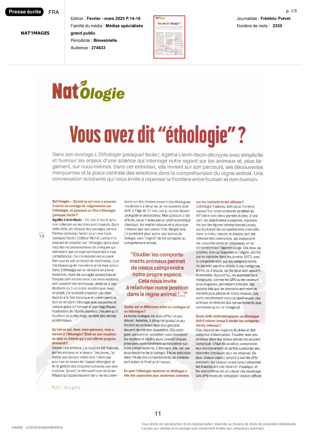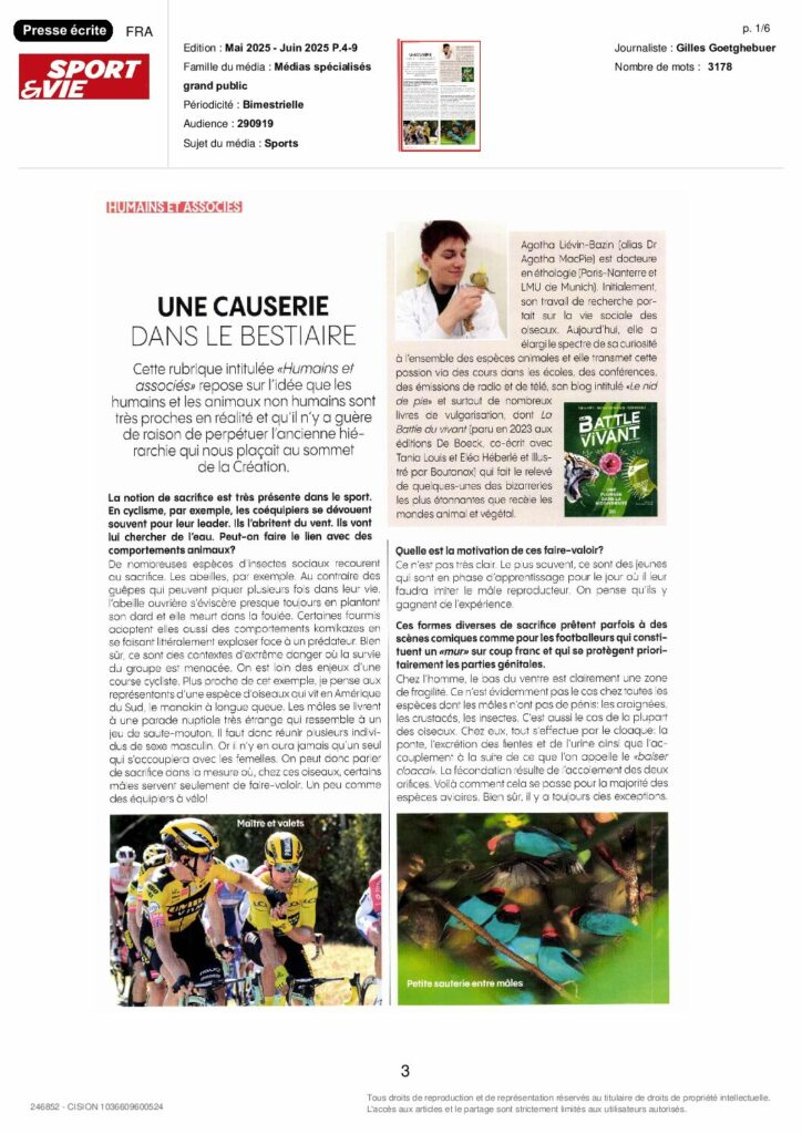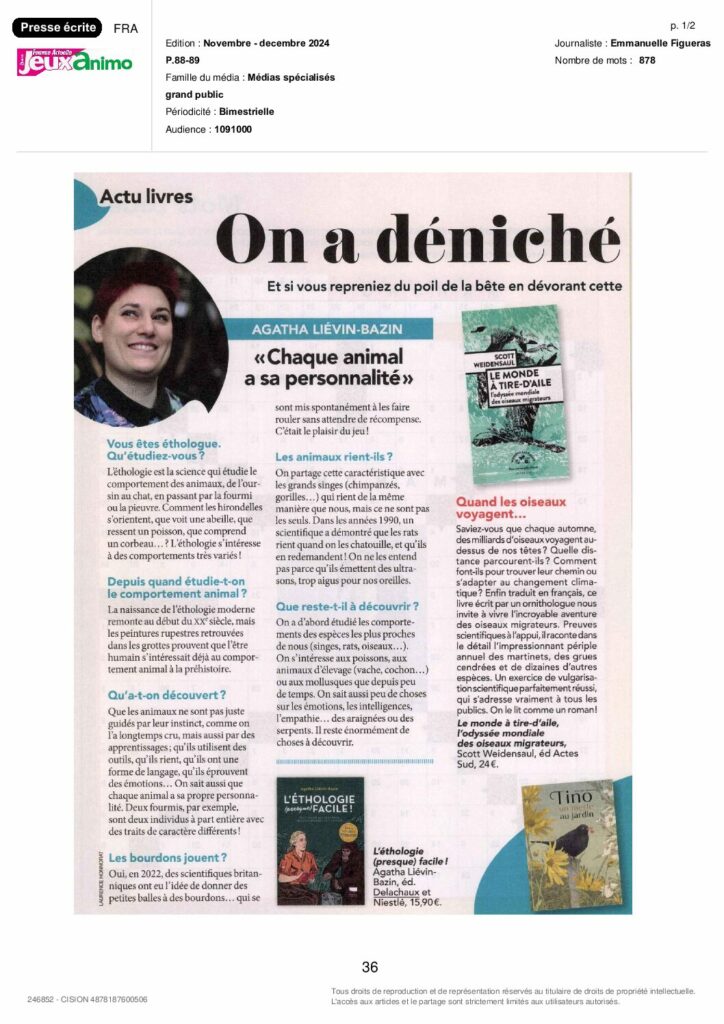 J’ai travaillé avec Stéphane Debove et Leïla Yassine, sur le texte du chapitre sur l’infanticide chez les animaux que j’ai également illustré ainsi que sur la vidéo complémentaire, et j’ai rédigé et illustré seule le chapitre sur l’intelligence des oiseaux.